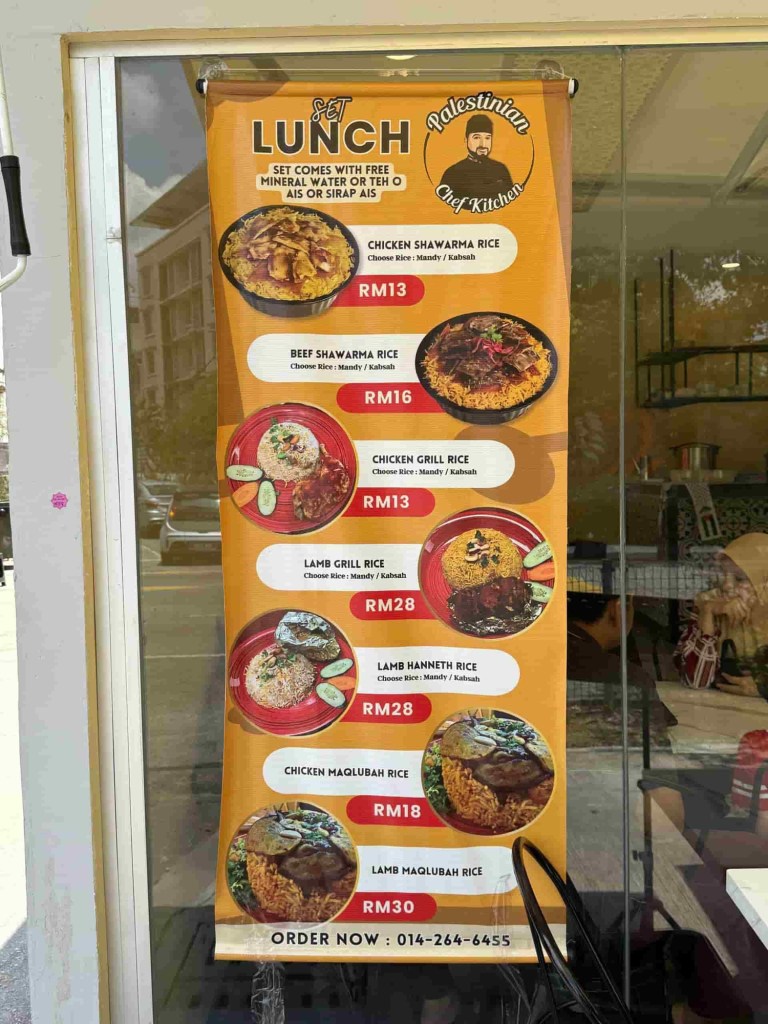 Bagi pelanggan yang datang pada waktu tengah hari, restoran ini turut menyediakan set makan tengah hari yang sangat berbaloi. Set lunch di Palestinian Chef Kitchen disertakan dengan air mineral atau pilihan minuman percuma seperti Teh O Ais atau Sirap Ais. Antara pilihan set yang ditawarkan termasuk Chicken Shawarma Rice (RM13), Beef Shawarma Rice (RM16), Chicken Grill Rice (RM13), Lamb Grill Rice (RM28), Lamb Hanneth Rice (RM28), Chicken Maqlubah Rice (RM18), dan Lamb Maqlubah Rice (RM30). Setiap hidangan boleh dipilih bersama nasi Mandy atau Kabsa, menjadikannya pilihan ideal untuk hidangan cepat tanpa mengorbankan rasa asli Palestin.