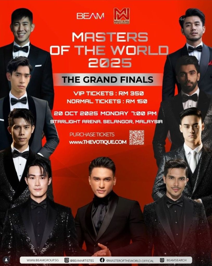 Final Masters of the World 2025 bakal berlangsung dengan tiket VIP berharga RM350 (dengan hidangan meja bulat) dan tiket biasa RM150 (tempat duduk bebas dengan bufet disediakan). Maklumat lanjut dan undian boleh didapati di www.thevotique.com.